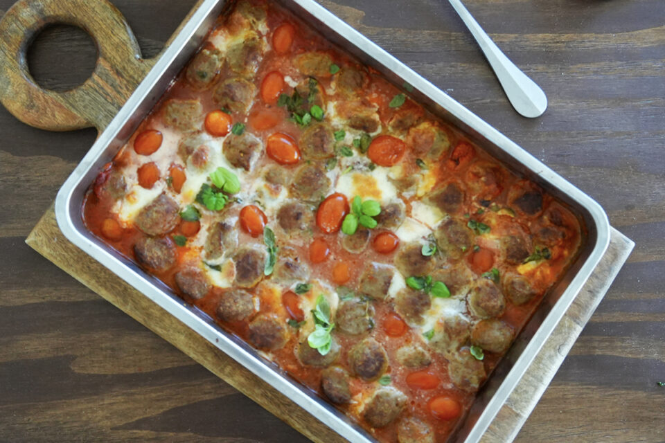 - Lisää Göranin lihapullat, kirsikkatomaatit ja mozzarellajuusto.