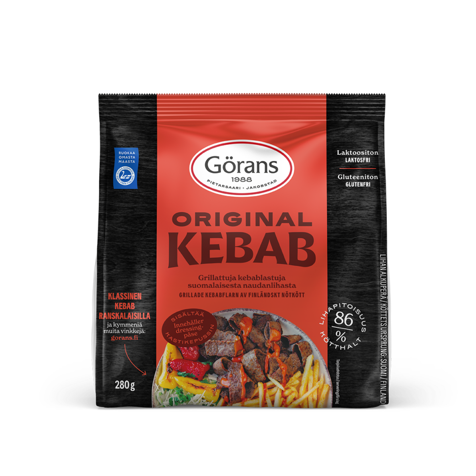 Grillattuja kebablastuja 100% suomalaisesta lihasta, mukana kebabkastike. Lastut ovat valmiiksi kypsiä ja valmiita nautittavaksi – lämmitettyinä tai sellaisenaan!